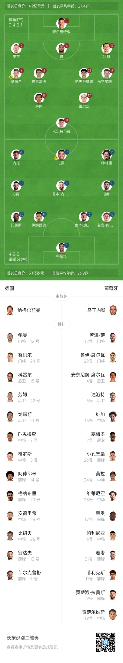 6月5日訊 歐國聯A聯賽半決賽,德國主場迎戰(zhàn)葡萄牙,賽前首發(fā)名單公布。