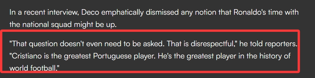德科說:“這根本就是一個不需要問的問題,而且是缺乏尊重的??死锼沟賮喼Z是葡萄牙最偉大的球員,他也是世界足球歷史上最偉大的球員。”