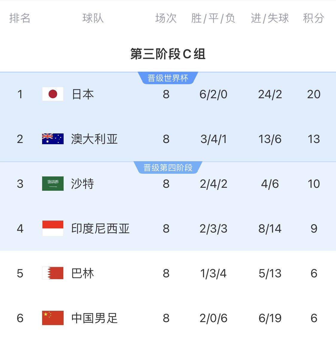 末輪印尼客場不勝日本,國足勝巴林,國足12分晉級附加賽。本輪巴林不勝沙特、末輪印尼客場負日本、國足平巴林即進前4。