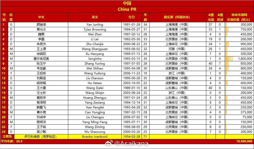 國足23人名單平均年齡28.4歲,總身價(jià)為1080萬歐元,身價(jià)最高的球員是塞爾吉尼奧,達(dá)到180萬歐元,他也是唯一一位身價(jià)超過100萬歐的球員。