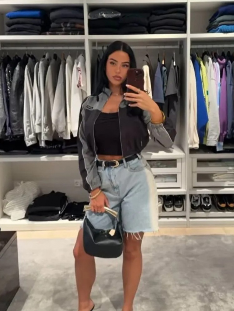 她在帖子中添加的最后一張是一張鏡子自拍照,照片中她似乎在一家服裝店,手里拿著一個(gè)手提包,穿著之前看到的彩色夾克和藍(lán)色短褲。