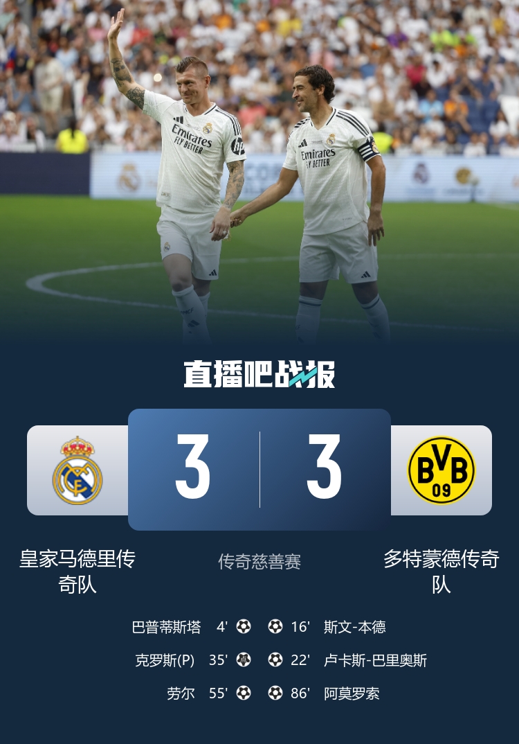 06月07日訊 6月7日晚18點(diǎn),皇馬傳奇隊(duì)vs多特傳奇隊(duì)的傳奇慈善賽在伯納烏球場(chǎng)打響。經(jīng)過(guò)90分鐘較量,皇馬傳奇隊(duì)與多特傳奇隊(duì)?wèi)?zhàn)成3-3平。