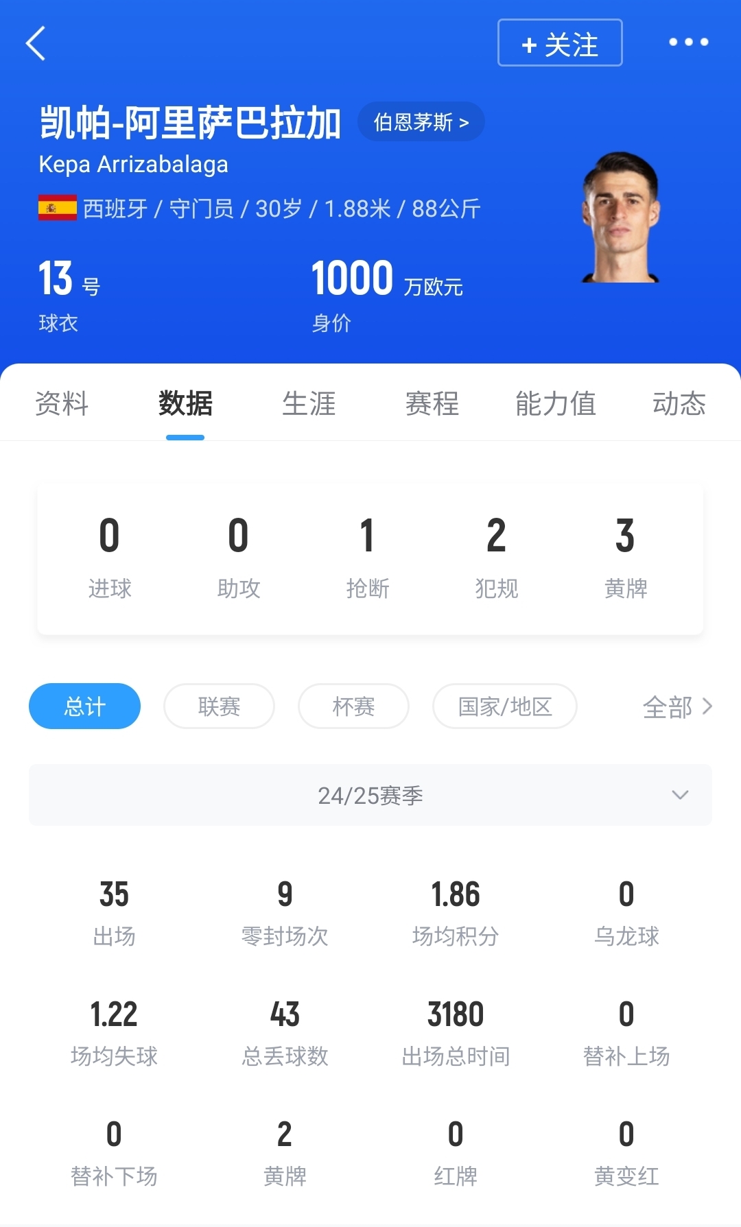 凱帕現(xiàn)年30歲,他在2018年以7160萬鎊的創(chuàng)紀錄高價轉會至切爾西,為切爾西出戰(zhàn)163次。此后,他分別租借至皇馬和伯恩茅斯,他上賽季為伯恩茅斯出戰(zhàn)35次,貢獻9次零封。