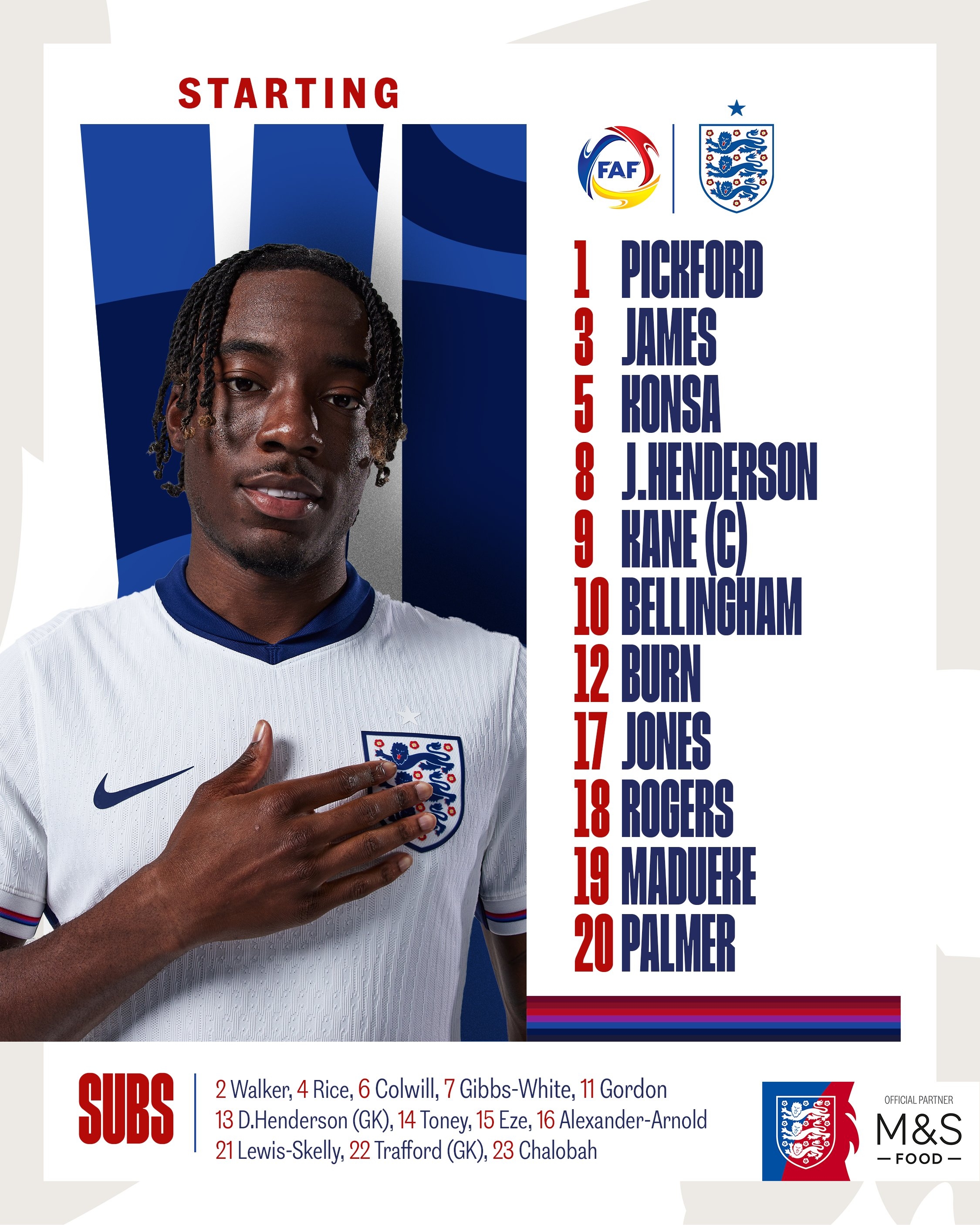 英格蘭替補(bǔ):13-迪恩-亨德森、22-特拉福德、2-沃克、4-賴斯、6-科爾維爾、7-吉布斯-懷特、11-安東尼-戈登、14-伊萬-托尼、15-埃澤、16-阿諾德、21-斯凱利、23-查洛巴