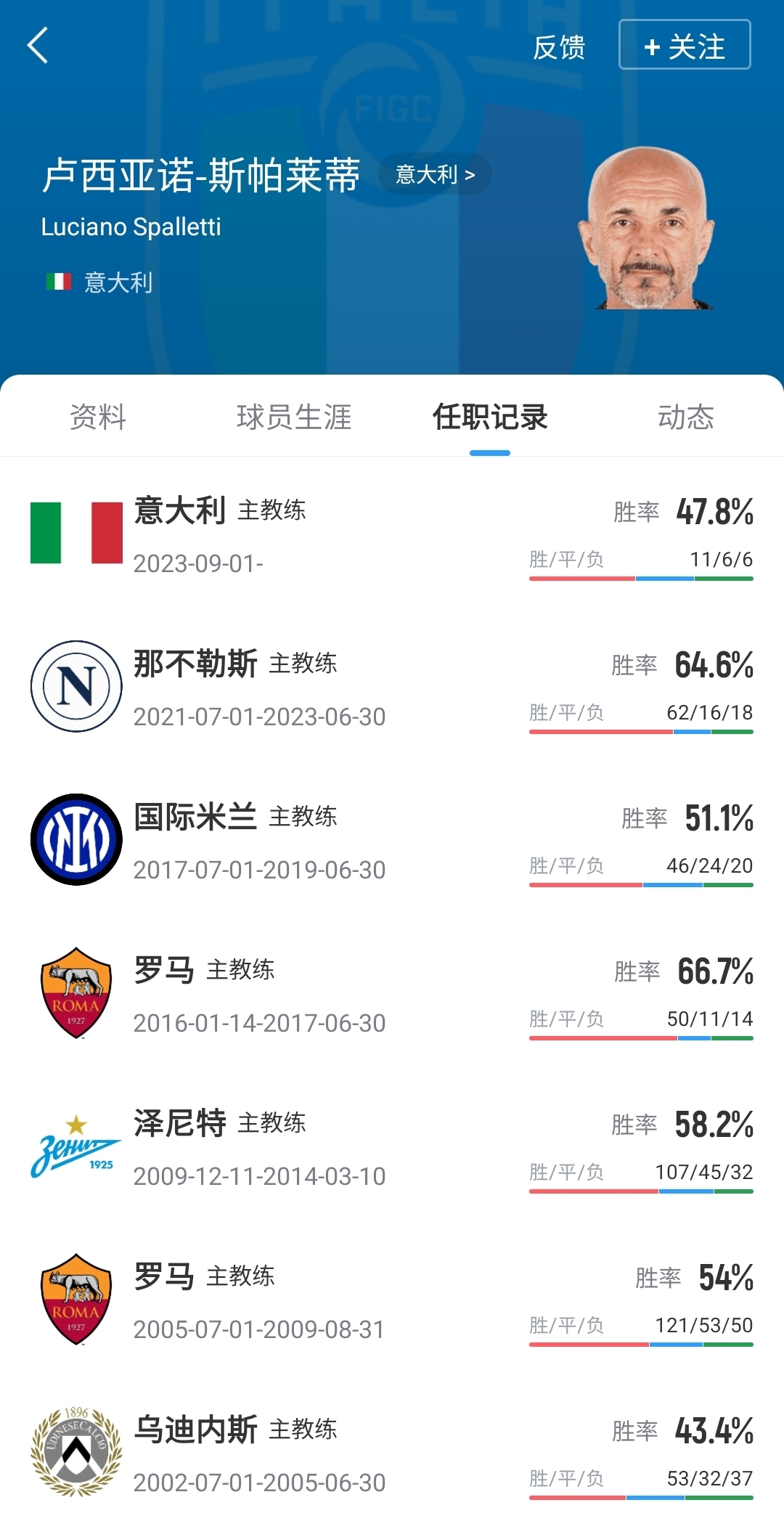 斯帕萊蒂于2023年夏天擔(dān)任意大利國家隊主教練,至今帶隊23場,戰(zhàn)績?yōu)?1勝6平6負(fù)。在6月初的世預(yù)賽上,他帶領(lǐng)的意大利隊0-3慘敗于挪威,晉級前景蒙上陰影。