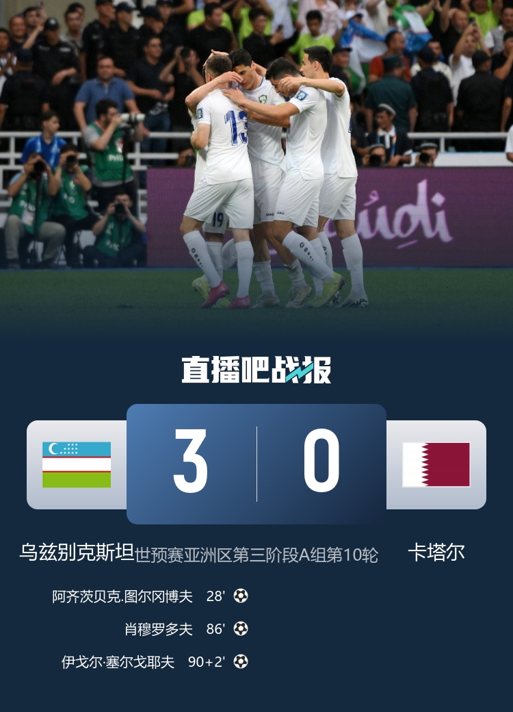 全場比賽結束,烏茲別克斯坦3-0擊敗卡塔爾。