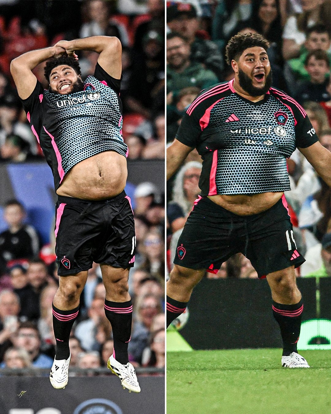 Big Zuu進(jìn)球后十分興奮,跑到場邊做出C羅的Siu慶祝時得到了全場觀眾的配合。由于他體型過大,超大碼球衣甚至也沒能蓋住他慶祝時的肚皮,抓拍下來的瞬間顯得更為滑稽。