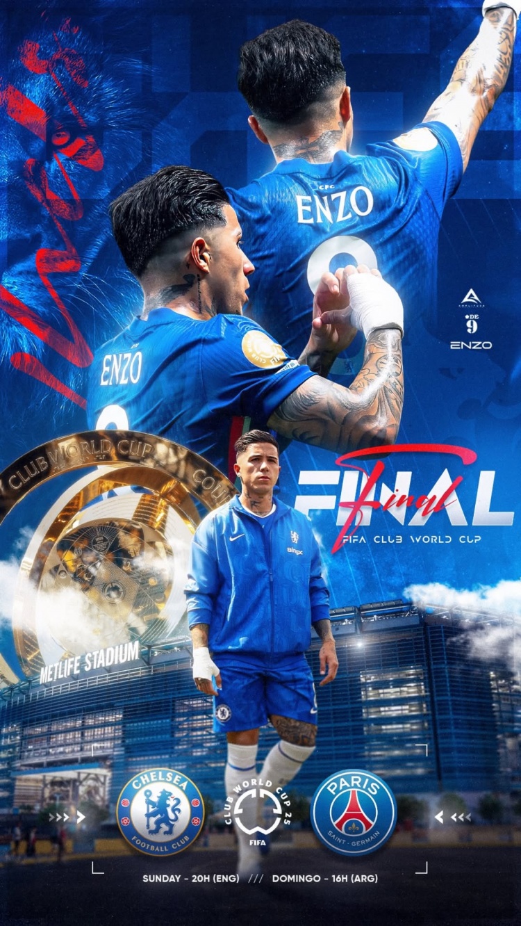切爾西中場恩佐-費爾南德斯更新社媒動態(tài),曬出世俱杯決賽個人海報,預(yù)熱這場重要的比賽,海報背景為大都會人壽體育場和世俱杯獎杯。