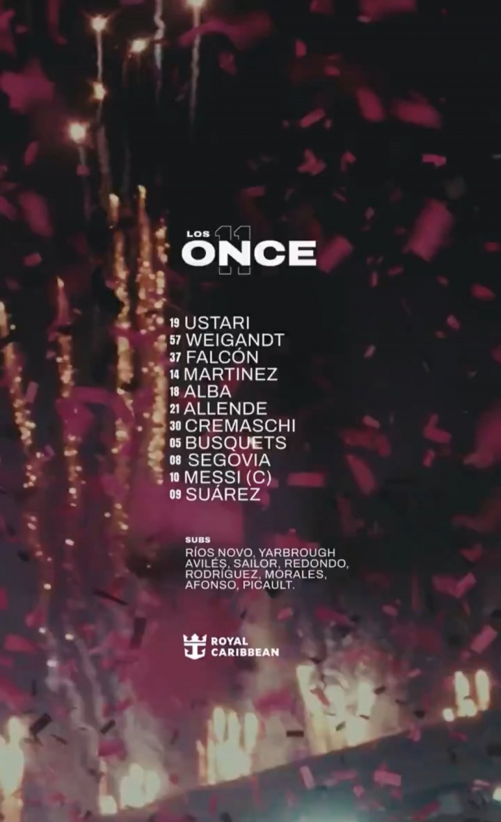 邁阿密國際首發(fā):19-烏斯塔里、57-韋甘特、37-法爾肯、14-赫克托-馬丁內(nèi)斯、18-阿爾巴、21-阿連德、30-克雷馬斯基、5-布斯克茨、8-特拉斯科、10-梅西、9-蘇亞雷斯
