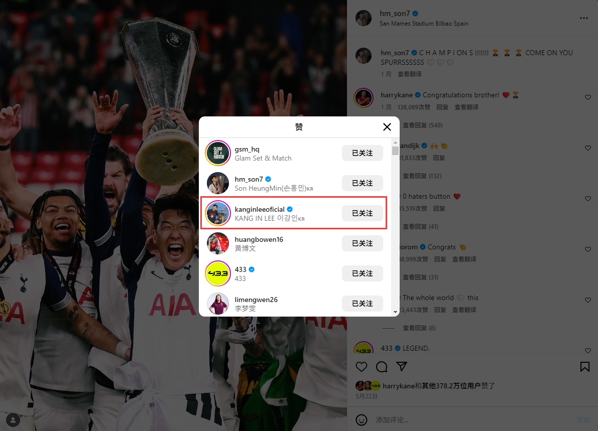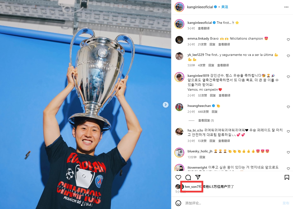 本賽季,熱刺奪得歐聯(lián)冠軍,此前孫興慜曬照慶祝時(shí)李剛?cè)室颤c(diǎn)了贊。