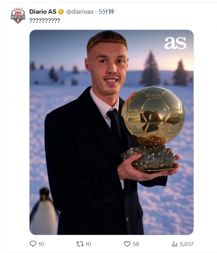 07月14日訊 世俱杯決賽半場(chǎng)未結(jié)束,切爾西已經(jīng)3-0領(lǐng)先巴黎!帕爾默半場(chǎng)兩射一傳,西班牙媒體阿斯報(bào)曬出帕爾默手捧金球獎(jiǎng)P圖。