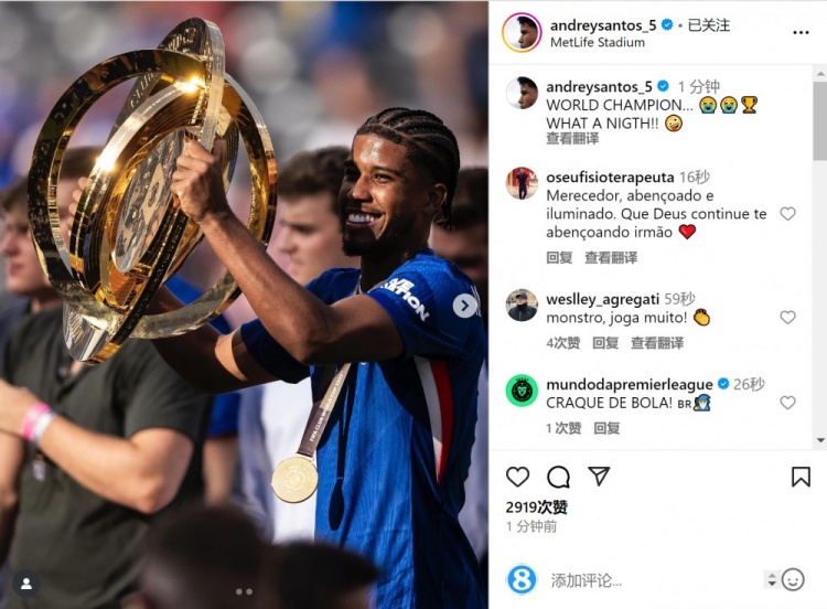 安德烈-桑托斯社媒曬出舉起獎(jiǎng)杯的照片,配文:“世界冠軍,多么美妙的夜晚!”