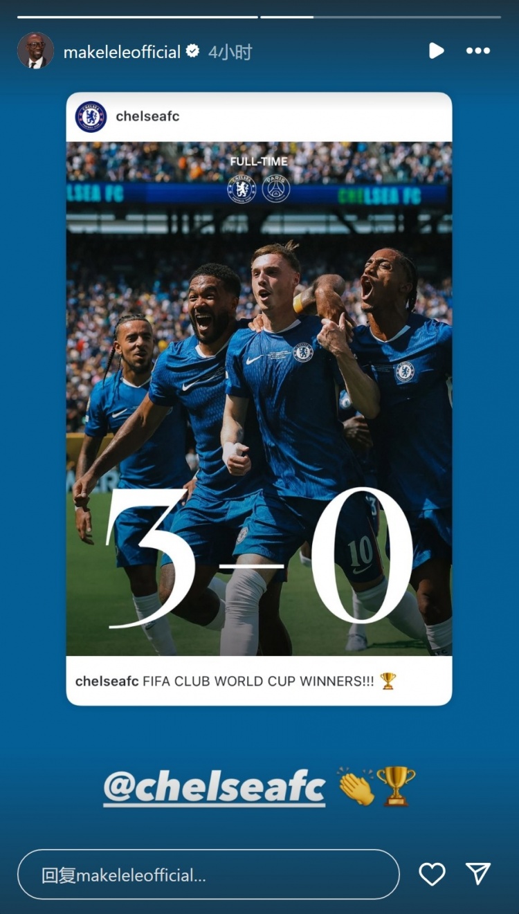 切爾西名宿馬克萊萊現(xiàn)場(chǎng)觀看了這場(chǎng)比賽,他在社交媒體上轉(zhuǎn)發(fā)切爾西的奪冠海報(bào),祝賀老東家問(wèn)鼎世俱杯。