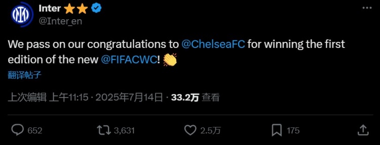 國米官方寫道:“我們向切爾西表示祝賀,恭喜他們贏得了首屆新版的世俱杯冠軍!”