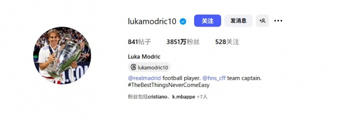 莫德里奇此前的個(gè)人簡(jiǎn)介為皇馬球員,在加盟AC米蘭后,莫德里奇已經(jīng)將自己的社媒簡(jiǎn)介改為了AC米蘭球員。