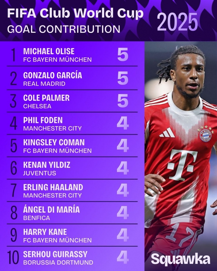 5球,奧利塞(拜仁)、貢薩洛-加西亞(皇馬)、帕爾默(切爾西)