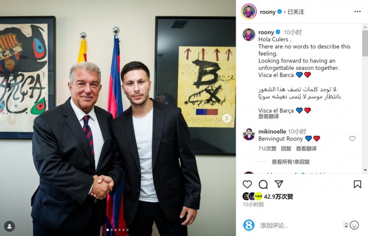 巴德吉社媒曬出與拉波爾塔的合照,并寫道:“你好,巴薩球迷們!無法用言語形容這種感覺,期待與大家一起度過一個(gè)難忘的賽季,巴薩萬歲!”