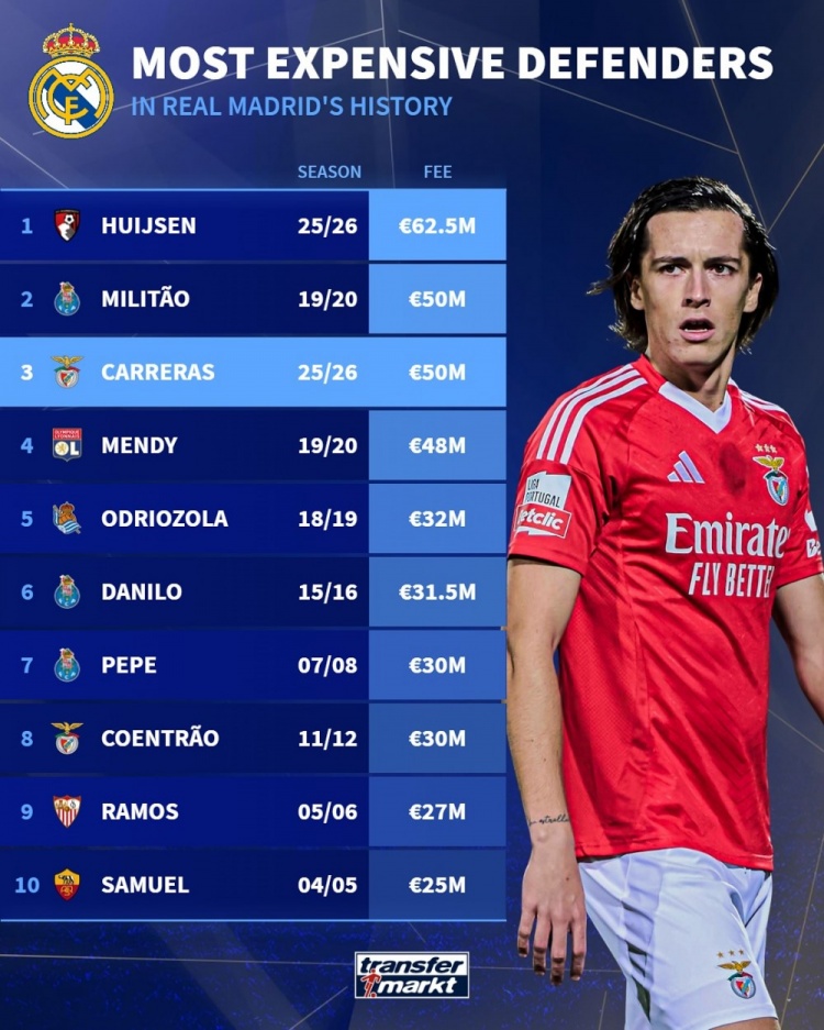 皇馬隊(duì)史引進(jìn)后衛(wèi)轉(zhuǎn)會(huì)費(fèi)排名: