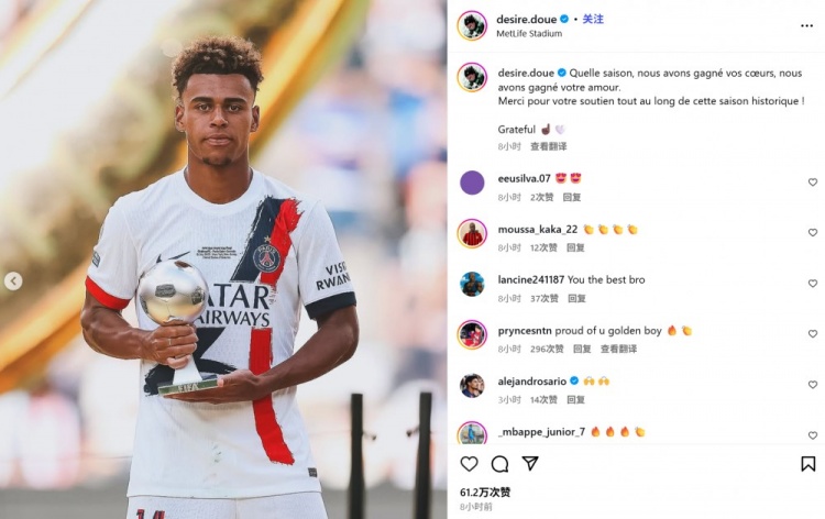 杜埃也在今日通過社媒曬出自己領(lǐng)取獎杯的照片,并配文:“多么精彩的賽季!我們已經(jīng)贏得了你們的心,贏得了你們的愛。感謝你們在這個歷史性的賽季里給予我們的支持!感激不盡?????”