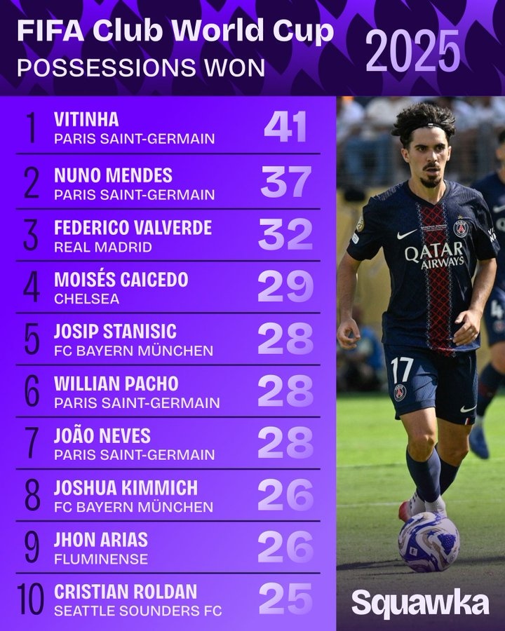 7月15日訊 Squawka統(tǒng)計(jì)了世俱杯搶回球權(quán)數(shù)據(jù),維蒂尼亞41次排名第一。