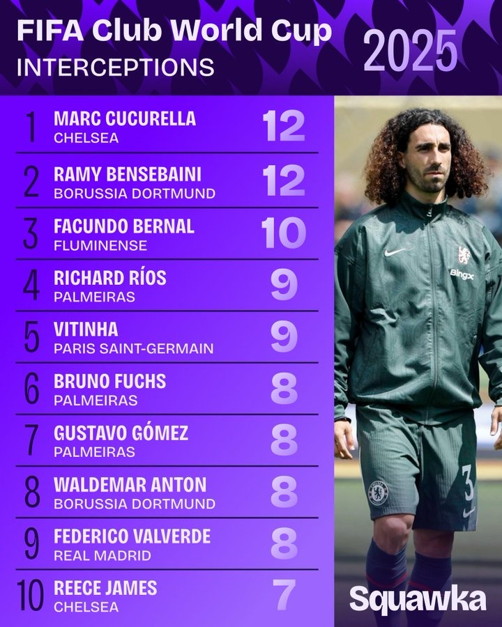 7月15日訊 Squawka統(tǒng)計(jì)了世俱杯賽事攔截次數(shù)排名,庫(kù)庫(kù)雷利亞和本塞拜尼12次并列第一。