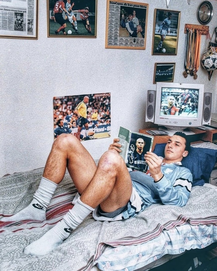 EA的游戲封面復(fù)刻了伊布年少時的一張照片,照片中的老式電腦、大羅海報、獎牌、裝飾等都得到了還原。