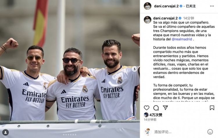 7月17日訊 皇馬官方宣布巴斯克斯自由身離隊,前皇馬隊友卡瓦哈爾更新社交媒體曬照發(fā)長文深情告別巴斯克斯。