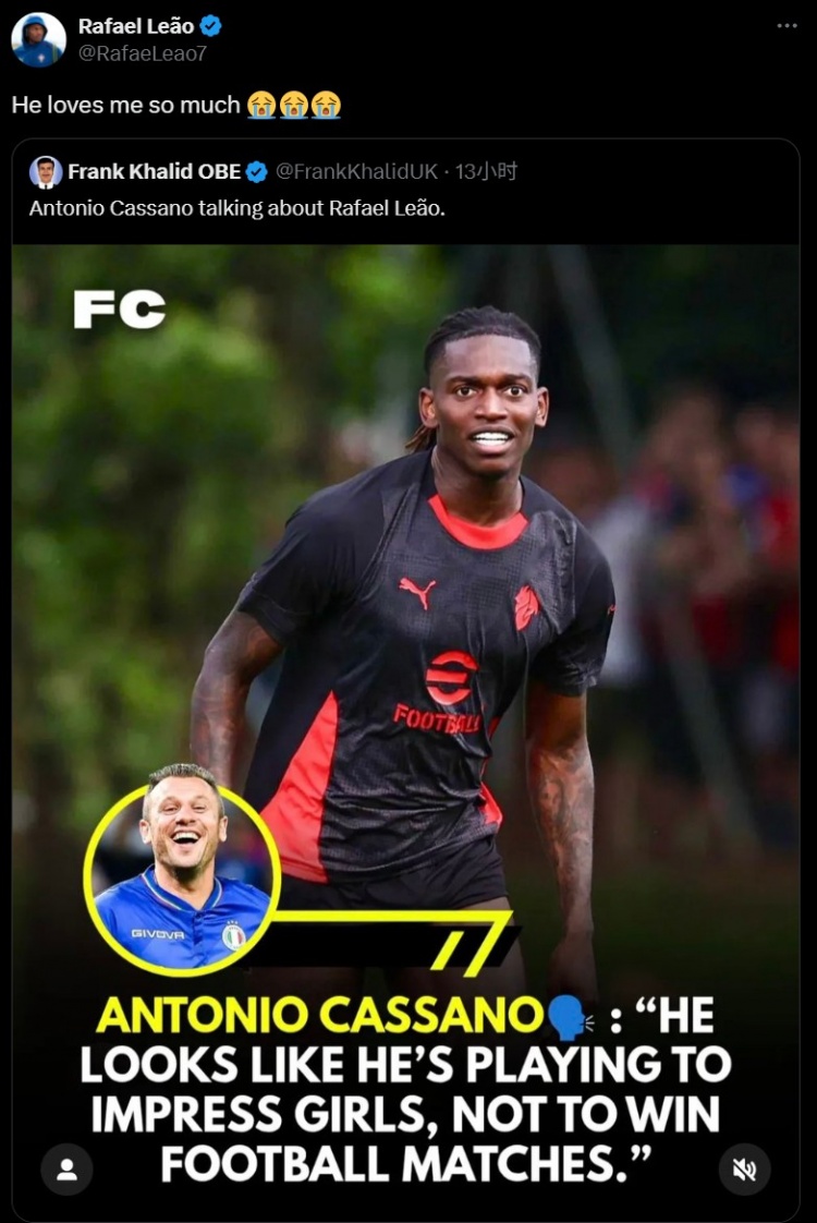 萊奧則通過社媒轉(zhuǎn)發(fā)了這一批評,并諷刺道:“他太愛我了????”