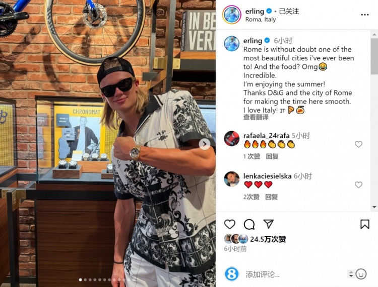 哈蘭德攜女友在羅馬度假并參加商業(yè)活動(dòng),他在社交媒體上曬出多張照片,并配文:“羅馬無(wú)疑是我去過(guò)最美麗的城市之一!而美食?天啊?? 太棒了。