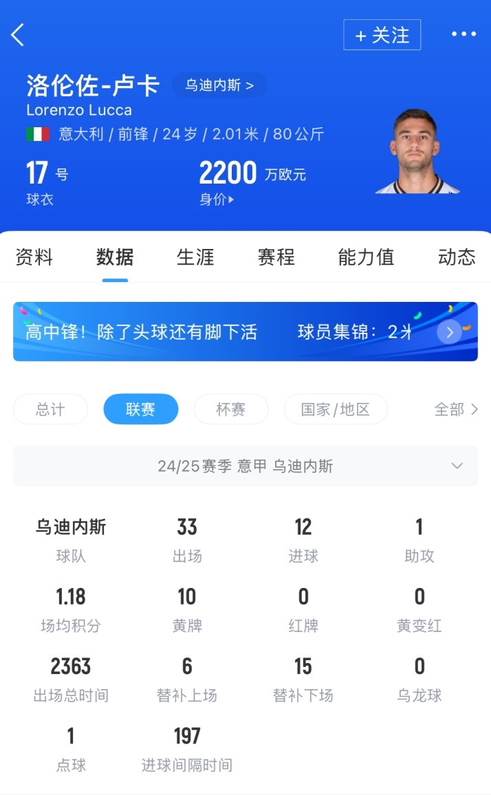 洛倫佐-盧卡現(xiàn)年24歲,身高2.01米,他上賽季為烏迪內(nèi)斯出戰(zhàn)36場(chǎng),貢獻(xiàn)14球1助攻,目前他的身價(jià)為2200萬(wàn)歐。