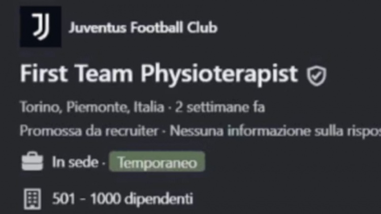 但這還不是全部。在這個轉(zhuǎn)會市場火熱進(jìn)行的時期,尤文還將目光投向了“理療師市場”,尤文通過領(lǐng)英平臺進(jìn)行招聘。