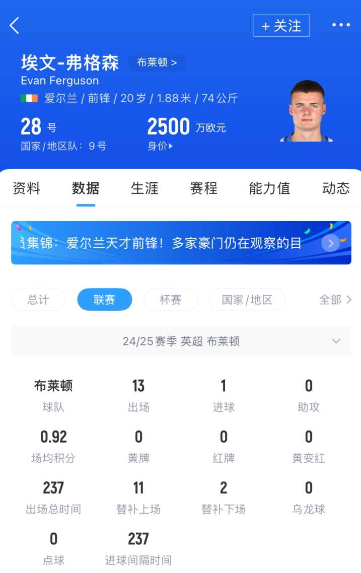 埃文-弗格森現(xiàn)年20歲,身高1米88司職中鋒,與布萊頓現(xiàn)有合同在2029年到期,現(xiàn)德轉(zhuǎn)估值2500萬歐。