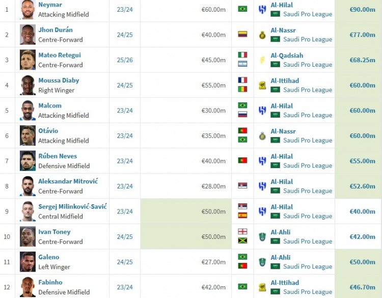 7月22日訊 卡迪西亞已經(jīng)官宣簽下雷特吉,據(jù)德轉(zhuǎn)統(tǒng)計(jì)他是沙特聯(lián)歷史第三貴引援,內(nèi)馬爾繼續(xù)以9000萬(wàn)歐的轉(zhuǎn)會(huì)費(fèi)領(lǐng)跑該榜單。
