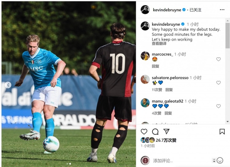 德布勞內(nèi)社媒曬出比賽照片,并配文:“很高興在今天上演首秀,這些比賽時(shí)間有助于恢復(fù)狀態(tài),讓我們繼續(xù)努力?!?/p>