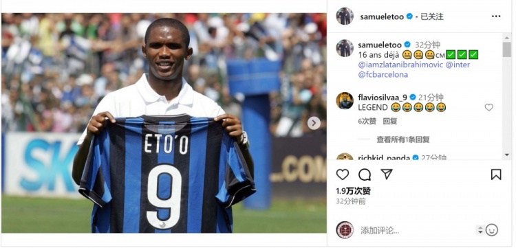 埃托奧社媒曬出自己與伊布當(dāng)時互換東家的照片,配文:“16年前?!辈伊布、國米和巴薩。