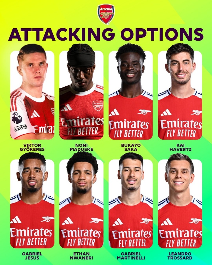 英超官方曬出阿森納的鋒線選擇,8人總身價4.94億歐,年齡普遍在23歲至28歲之間。