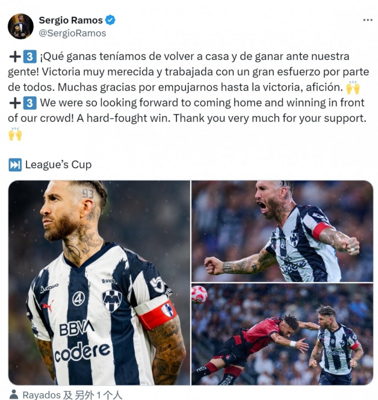 拉莫斯社媒曬出比賽照片,并寫道:“全取三分!我們非常期待回到主場,在我們的球迷面前取得勝利!”