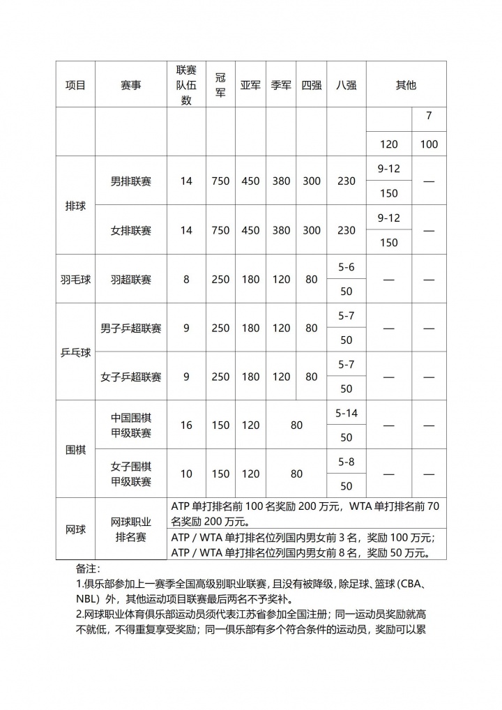 07月27日訊 江蘇省體育局發(fā)布《江蘇省職業(yè)體育俱樂部獎補(bǔ)標(biāo)準(zhǔn)》,俱樂部根據(jù)上一賽季參加的全國高級別職業(yè)聯(lián)賽成績申請獎補(bǔ)資金。