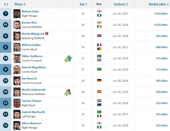 阿森納隊(duì)內(nèi)身價(jià)排名(單位:歐元/數(shù)據(jù)來源德轉(zhuǎn)):