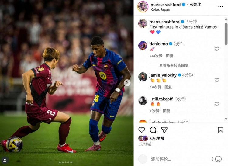 賽后拉什福德也在個人社媒曬出本場照片,配文寫道:“身穿巴薩球衣首次賽場亮相,加油????”