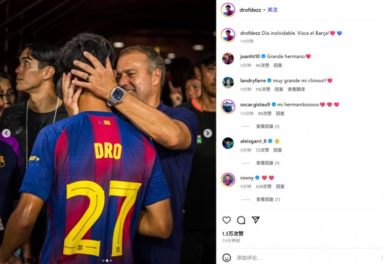 這位小將也通過社媒曬出同主帥弗里克互動的照片,并配文:“難忘的一天!巴薩萬歲!”