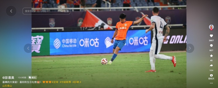 7月28日訊 泰山球員彭嘯更新社媒,慶祝球隊本輪贏球。