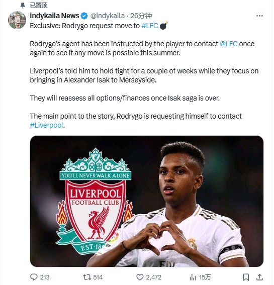 利物浦知名博主indykaila News發(fā)布獨(dú)家消息,羅德里戈請(qǐng)求轉(zhuǎn)會(huì)利物浦。不過(guò)這個(gè)轉(zhuǎn)會(huì)點(diǎn),西班牙或者英國(guó)媒體目前還未跟進(jìn)報(bào)道。