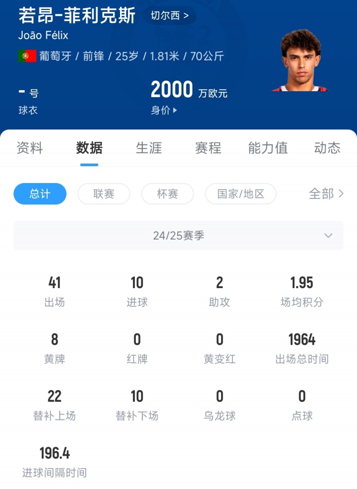 2023年1月,菲利克斯租借加盟切爾西,開啟了自己的流浪生涯。兩年間菲利克斯先后輾轉(zhuǎn)馬競、巴薩、切爾西、AC米蘭4支球隊,但在每支球隊效力都沒能超過半年,如今他遠走沙特加盟利雅得勝利。