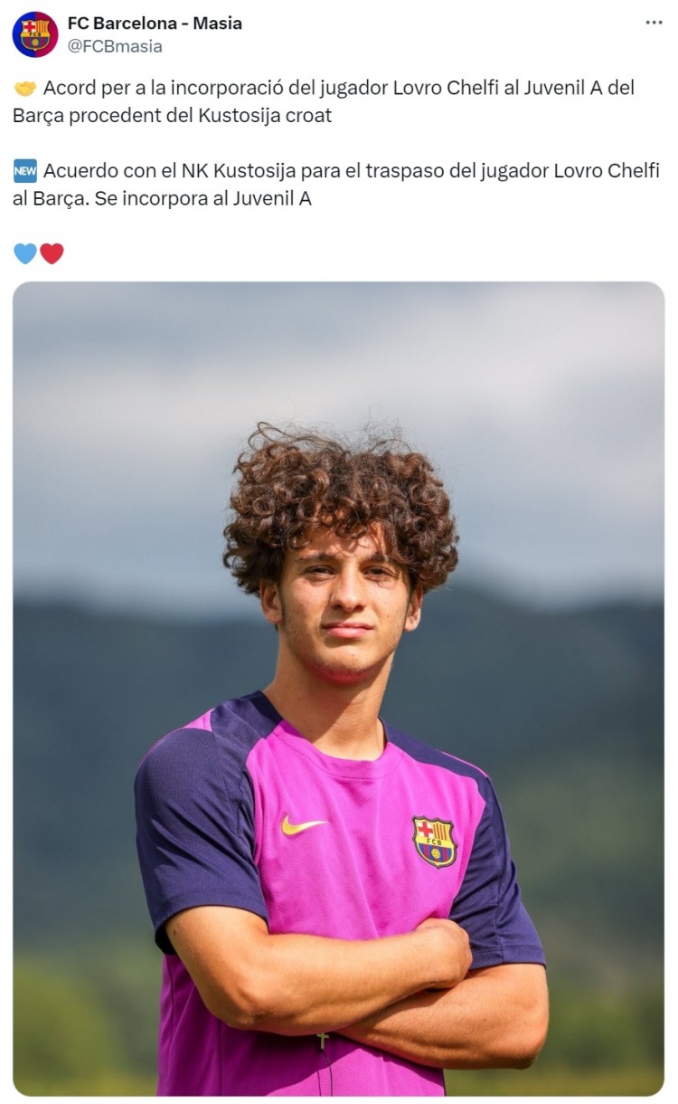 巴薩發(fā)布公告,宣布與庫斯托西亞就切爾菲的轉(zhuǎn)會達(dá)成協(xié)議,這位18歲的中場加盟巴薩青訓(xùn)A隊(duì)。