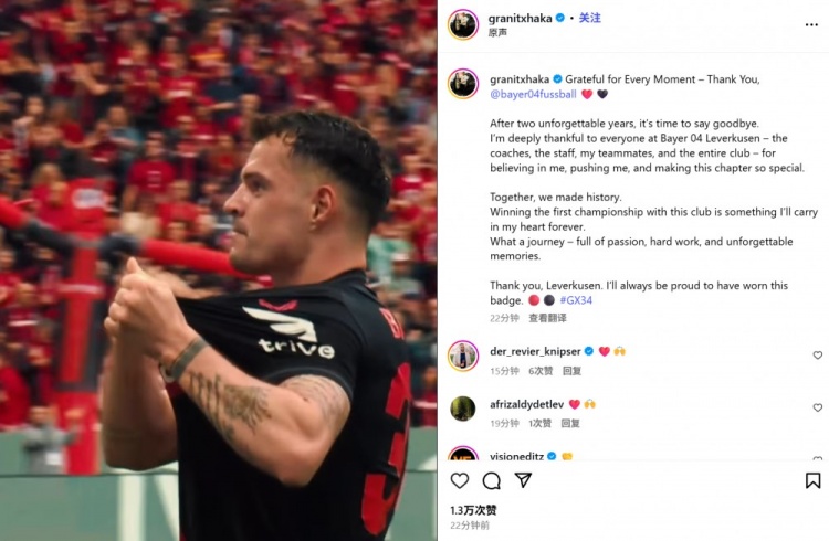 我深深地感謝勒沃庫森的每一個人——教練、工作人員、我的隊友以及整個俱樂部——感謝你們信任我、鞭策我,使這段時光如此特別。