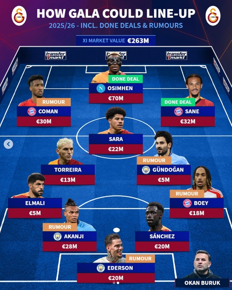 7月31日訊 加拉塔薩雷簽下奧斯梅恩只待正式官宣,《轉(zhuǎn)會(huì)市場(chǎng)》也根據(jù)近期動(dòng)向預(yù)測(cè)了加拉塔薩雷可能在新賽季排出的主力陣容,拜仁曼城各3將。