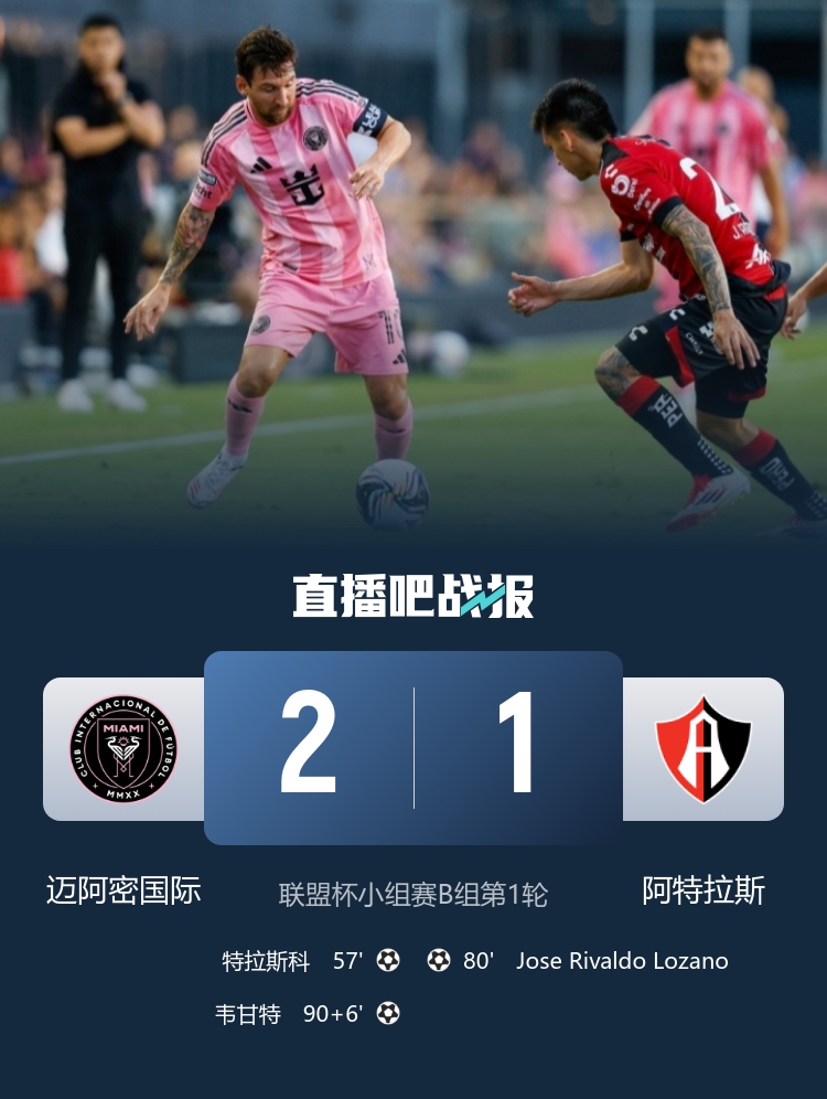 傷停補(bǔ)時(shí)5分鐘。全場比賽結(jié)束,邁阿密國際2-1阿特拉斯。