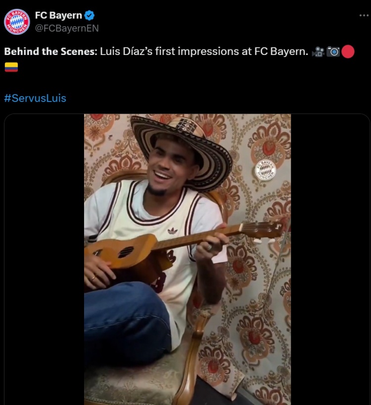 可以看到迪亞斯來到拜仁訓(xùn)練中心后,先是來到更衣室和新隊友們會面。他隨即進行了體檢,再拍攝了定妝照,其中不乏身披哥倫比亞國旗并頭戴牛仔帽彈吉他的造型,最后則來到辦公室和拜仁正式簽約至2029年。