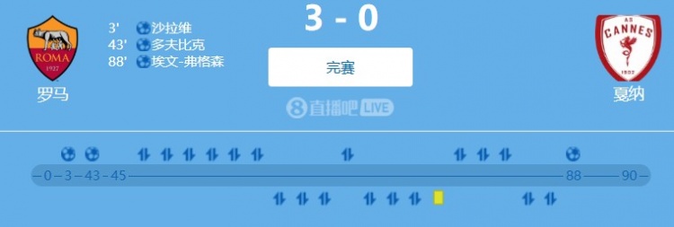 本場比賽,沙拉維開場3分鐘就為羅馬首開紀錄。上半場比賽臨近尾聲時,多夫比克將比分變成了2-0。下半場比賽,羅馬新援埃文-弗格森取得進球,幫助球隊將比分變成了3-0。值得一提的是,埃文-弗格森加盟后狀態(tài)出色,此前他在對陣凱澤斯勞滕的友誼賽中同樣取得進球。